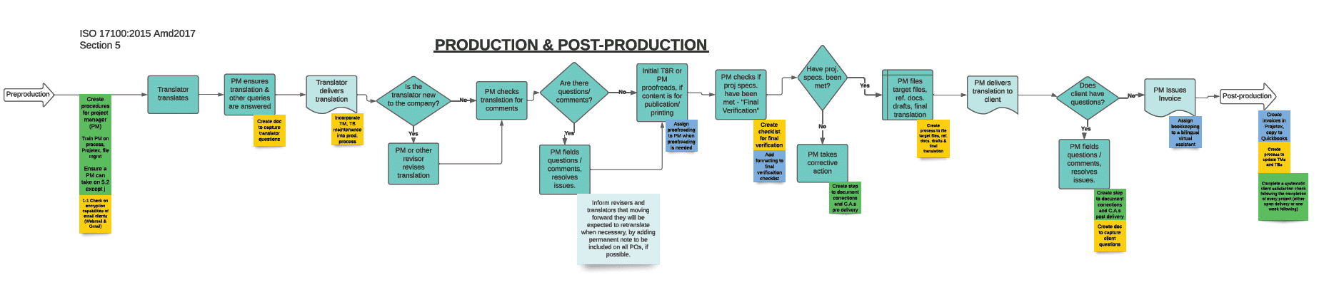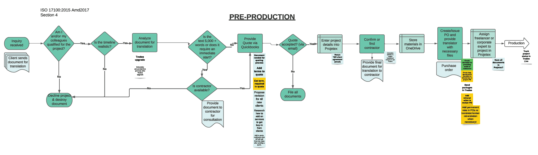 The quality assurance section of the standard focuses on managing the translation process to ensure quality services. Finding a qualified subcontractor, confirming their ability, and guaranteeing quality can be a challenge when time is of the essence, so I needed to develop a smoother subcontracting process. To get an overall view of my current project management process and where it needed improvement, Anees and I developed flowcharts and identified areas that needed improvement. In the end, I began issuing purchase orders to subcontractors, fielding translators’ questions using a standard template, standardizing project delivery, and consistently following up with clients at the end of each project to ensure their 100% satisfaction.