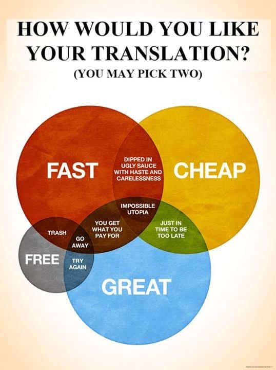 As the classic Venn diagram shows, if you want it fast and cheap, you’ll sacrifice quality. Giving translators more time and the freedom to translate from scratch ensures that you’ll get a translation that is not only accurate, but also original.